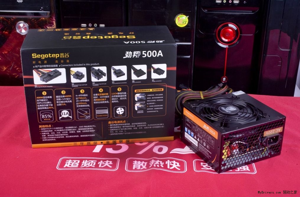 劲翔500A是劲翔家族的大哥。额定功率高达400W,满足主流3D游戏玩家的配置需求。由于主动式PFC和双管正激电路的应用,该款电源通过了80PLUS白牌认证,全程转换效率在80%以上,在典型负载下甚至可以达到85%的转换效率,直逼铜牌认证。较高的转换效率也意味着较低热量的排放,一把12CM大尺寸风扇以较低转速就可以轻松镇压劲翔500A。