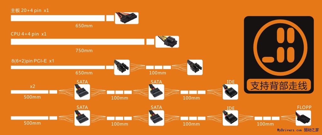 鑫谷雷诺塔倡导的背部走线概念深入人心,而随着夏天的到来,背部走线对散热带来的实际帮助也会逐渐显现。作为雷诺塔最佳搭档,劲翔500A必然具备超长的输出线材。要求最严格的CPU 4+4PIN部分,长达750MM,而主板20+4PIN部分也有650MM的奢侈长度,并且全部线材包裹黑色蛇皮网,对于黑化机箱的观感提升不言而喻。