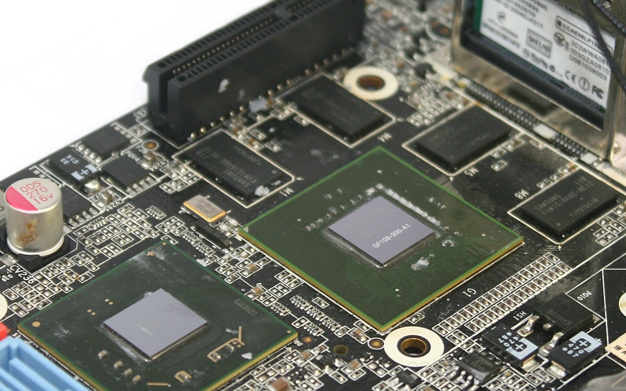 扩展插槽只有一条PCI-E X4,安置在散热器旁边的边角上,稍显寒颤。不过对于小板来说,再增加独立显卡的几率不大,何况主板已经板载了GT 430。(另外还提供了一个MiniPCI-E插槽,被无线网卡占用)
