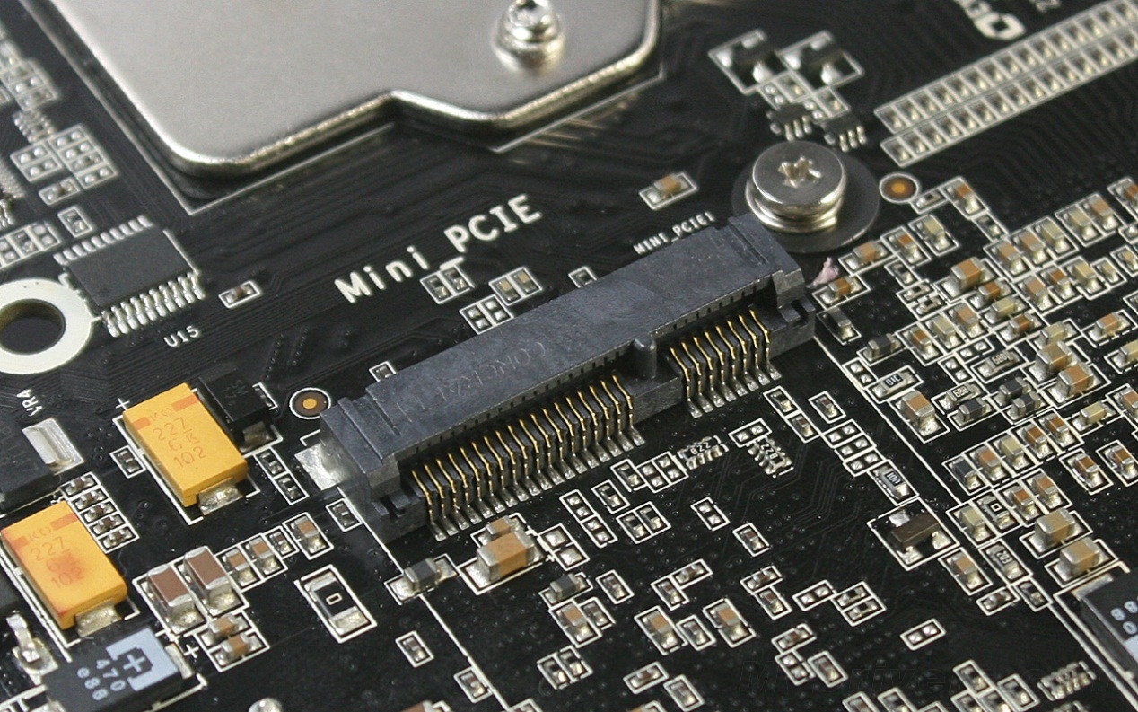 无线网卡安置在Mini PCI-E插槽上,比较特别的是这个Mini PCI-E插槽采用了少见的竖立式设计,更加便于设备安装。我们知道mSATA接口和Mini PCI-E接口可以通用,不过二者的内部通道类型却有所不同(mSATA走的SATA通道,而Mini PCI-E连接的是PCI-E通道,所以适用的设备也不一样),而旁边的蓝色跳线就可以起在PCI-E和SATA通道之间进行切换。