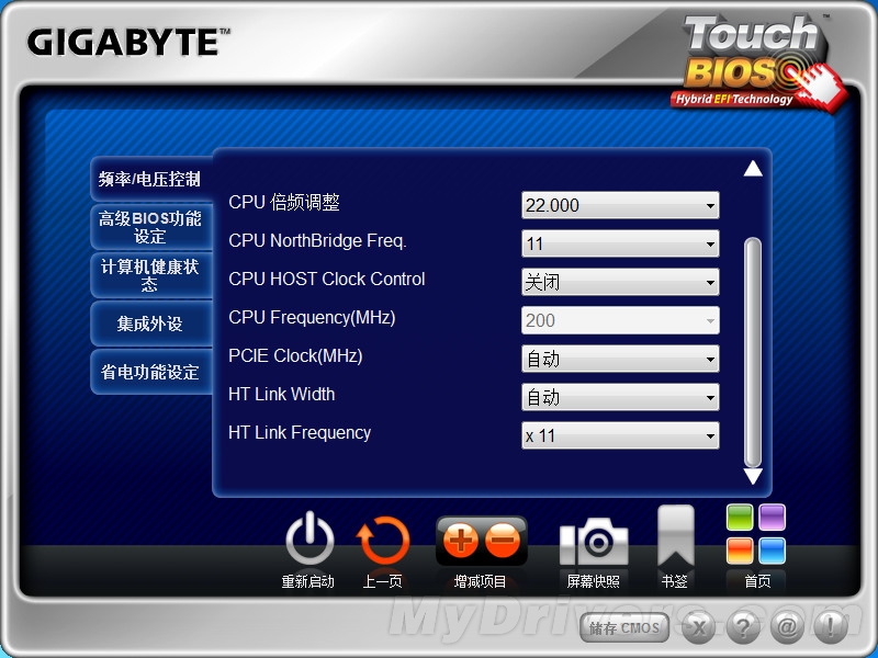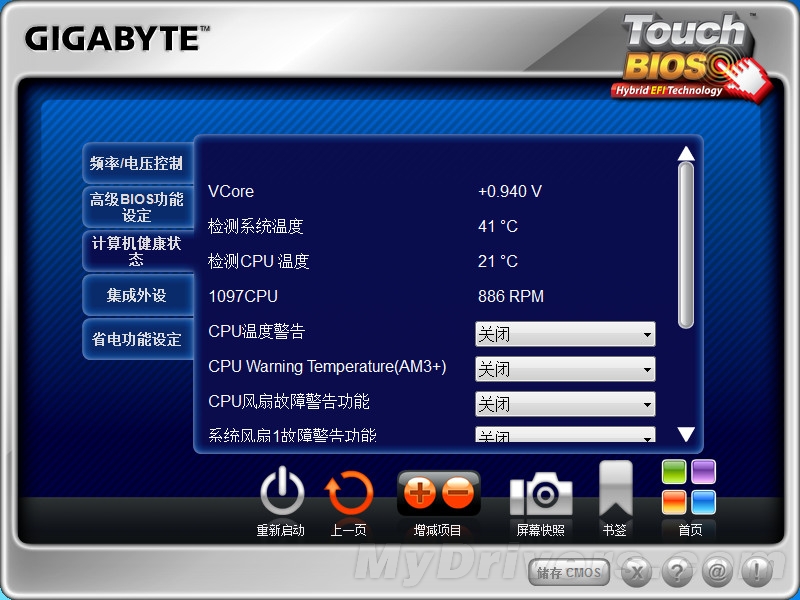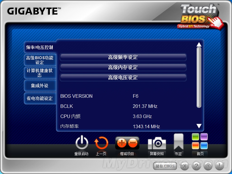 技嘉Touch BIOS的主界面,纯中文加图标显示,包括电压、高级功能、快速启动、查看计算机健康状态、更新BIOS、集成外设设备的设置、省电设置、以及优化默认设置等功能。如果要使用某一项功能,用鼠标点击相应的图标即可。