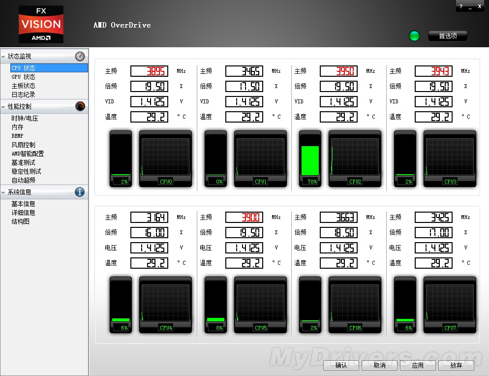 CPU状态监控栏我们还是要看一看的,一会用得到。在这里我们可以看到每个核心的温度、电压以及频率情况。