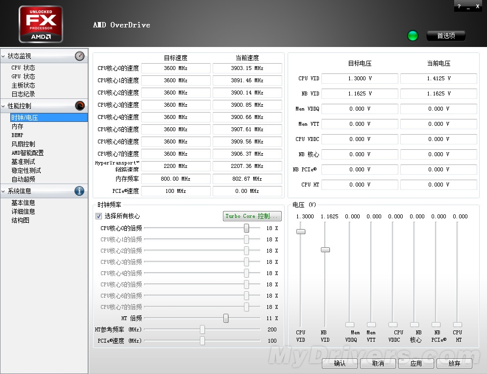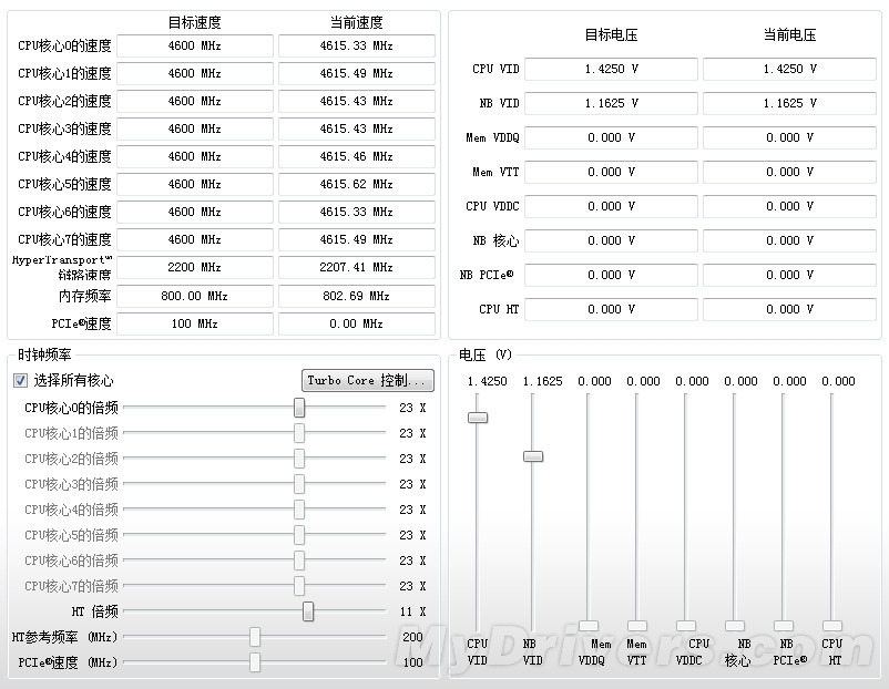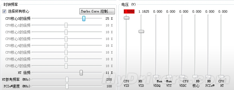 频率调节方面也十分简单,OverDrive软件默认为“选择所有核心”,也就是说用户只需调节一个核心的频率,其它的核心频率就会随之调节,并不需要单独调节每个核心的频率。用户可以通过窗口中的滑竿来调节推土机的倍频,步进为0.5×,在外频为200MHz的前提下,每次0.5×就是100MHz。核心频率调节完成以后,就要调节处理器的电压了,右侧的CPU VID就是调节CPU电压的选项,可以直接通过滑竿将CPU的电压调节至自己想要的状态。
