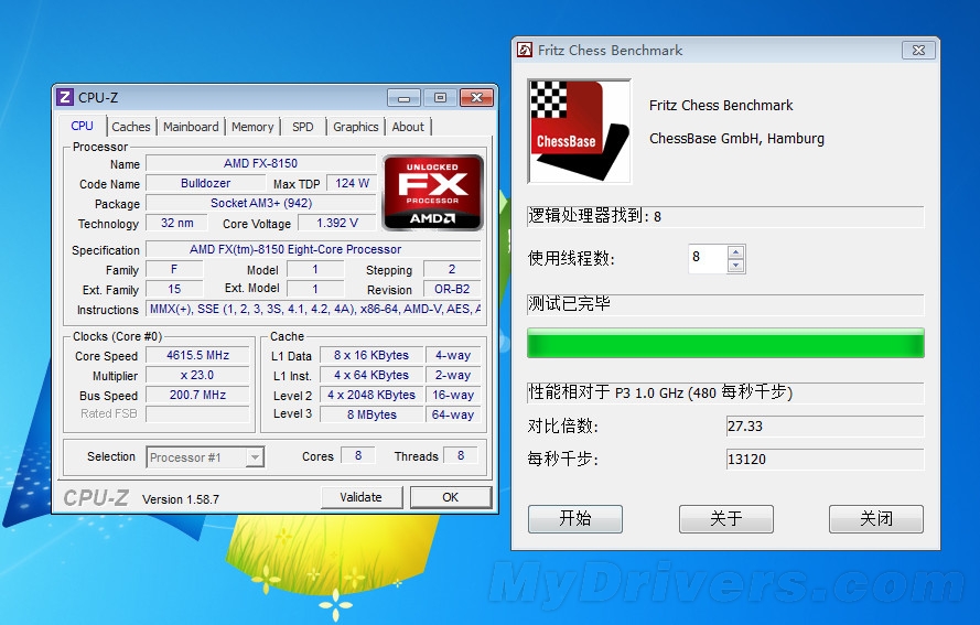 随后我们可以通过测试软件来测试超频之后的稳定性,Fritz Chess Benchmark便是可以检验CPU稳定性以及超频之后性能的软件,在测试过程中推土机八个核心均会达到满载状态,对CPU的稳定性是一个重大的考验。最终超频至4.6GHz的推土机顺利通过了国际象棋测试,最终成绩达到了每秒13120千步,相对于默认状态下的每秒11549千步有了不小的提升。