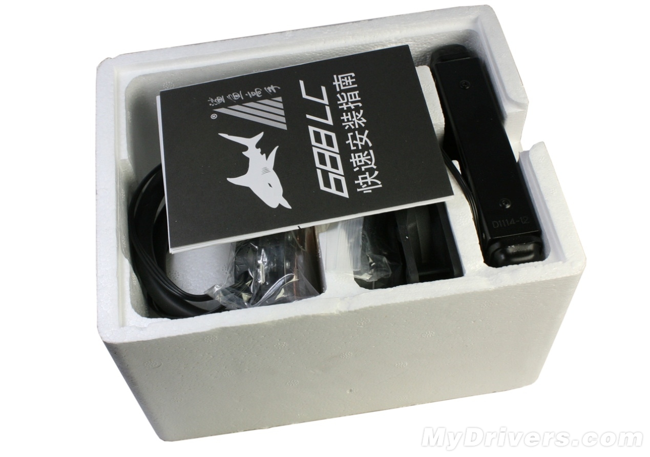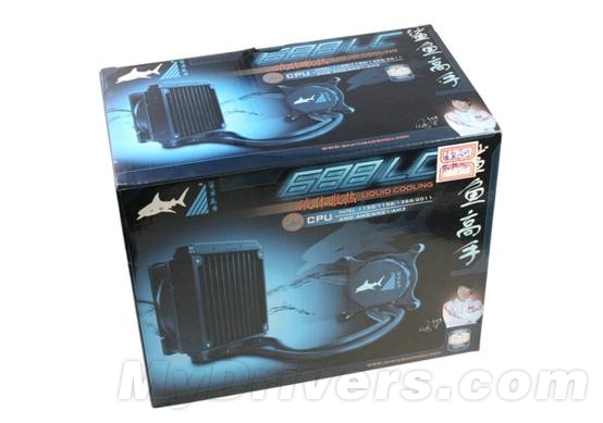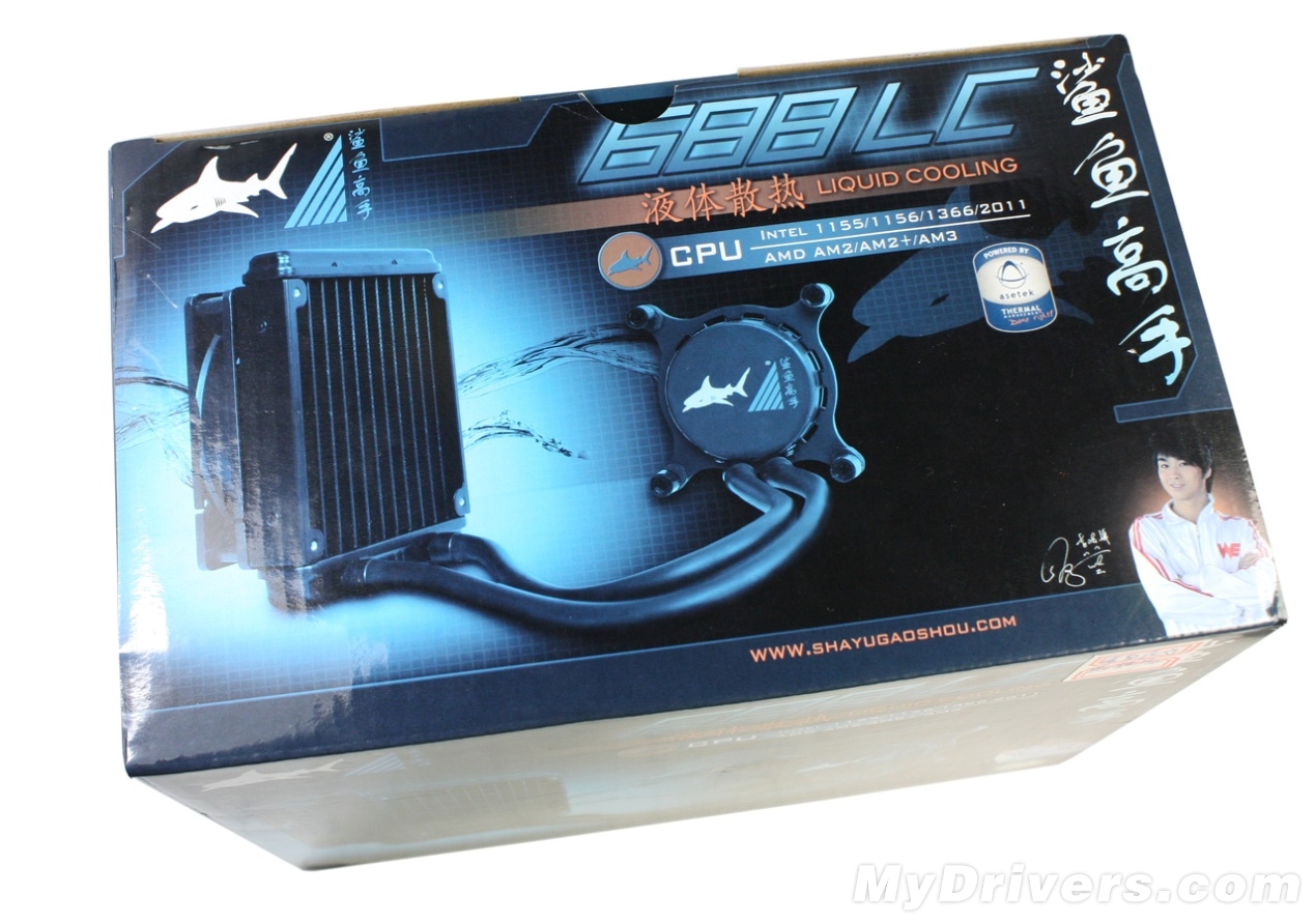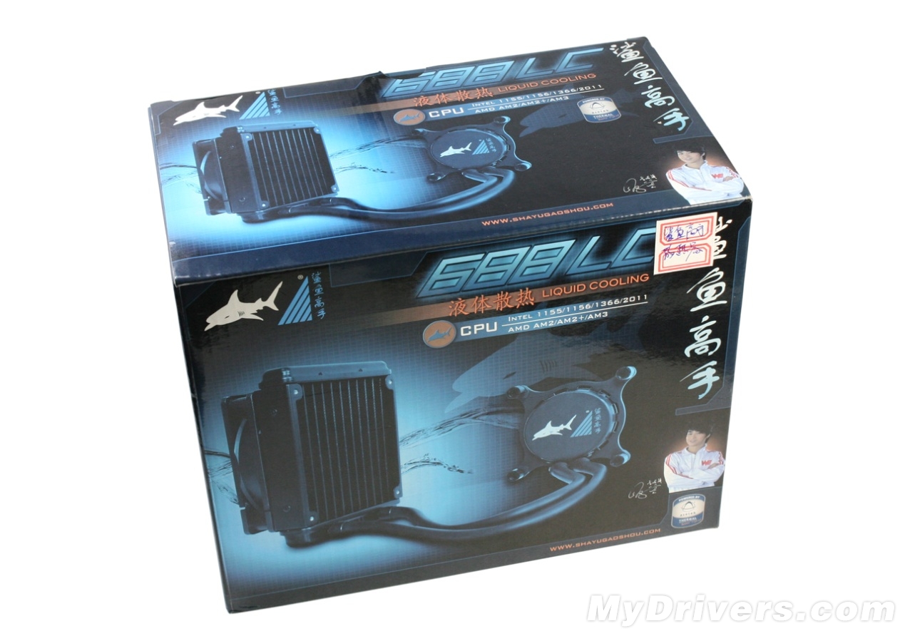 鲨鱼高手688LC散热器包装盒,大小与推土机以及SNB-E水冷散热器的包装盒大小一致,但外观上看起来更加精美一些。右下角那位就是人王SKY。