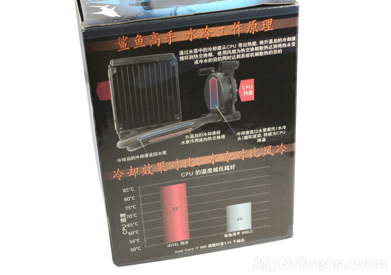 包装盒右侧是鲨鱼高手水冷散热器的工作原理以及散热效果图,明显比风冷强出一大截,当然实际效果我们随后再来验证。