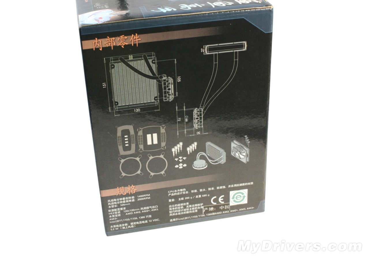 包装盒左侧是688LC水冷散热器内部的附件介绍以及详细规格介绍。688LC水冷散热器配备的风扇转速为1400RPM-2000RPM,水管长326mm,水冷排厚度为27mm,主板重200g,总重680g。
