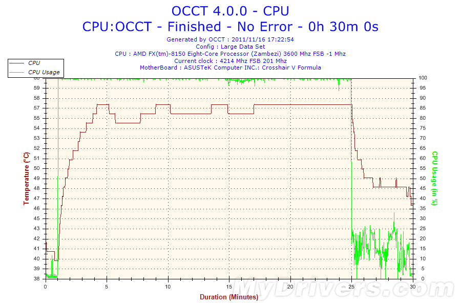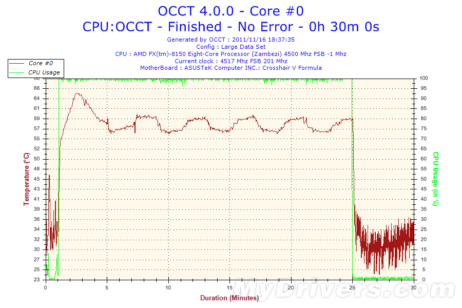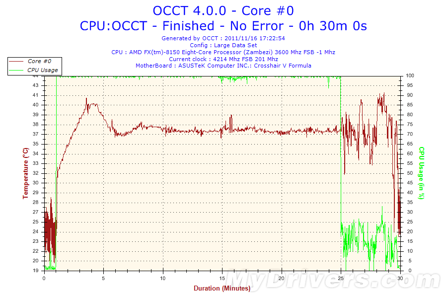 由于推土机FX-8150共有八颗核心,因此核心温度对比方面我们以核心0为例来进行对比,其余核心温度与核心0温度误差不超过1度。
