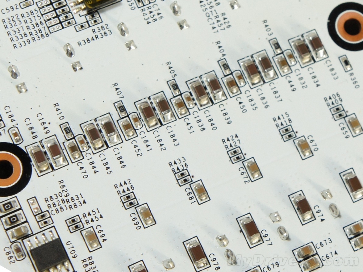 当然,PCB颜色工艺只能算是锦上添花,做工用料才是最实在的。可以看到PCB背面靠近GPU的部分安置了一颗NEC Proadlizer去耦电容、数颗三洋POS-CAP钽电容以及“小黄豆”钽电容。NEC Proadlizer去耦电容就不用多说了,高端的非公版显卡上经常见到,拥有极高的蓄电量和高速充放电效率,在高频下能够保证低ESR阻值,使电流更加纯净稳定,对显卡的超频能力大有裨益。而三洋POS-CAP钽电容以及“小黄豆”钽电容也是高端卡必备,同样具有稳压纯净电流的作用。