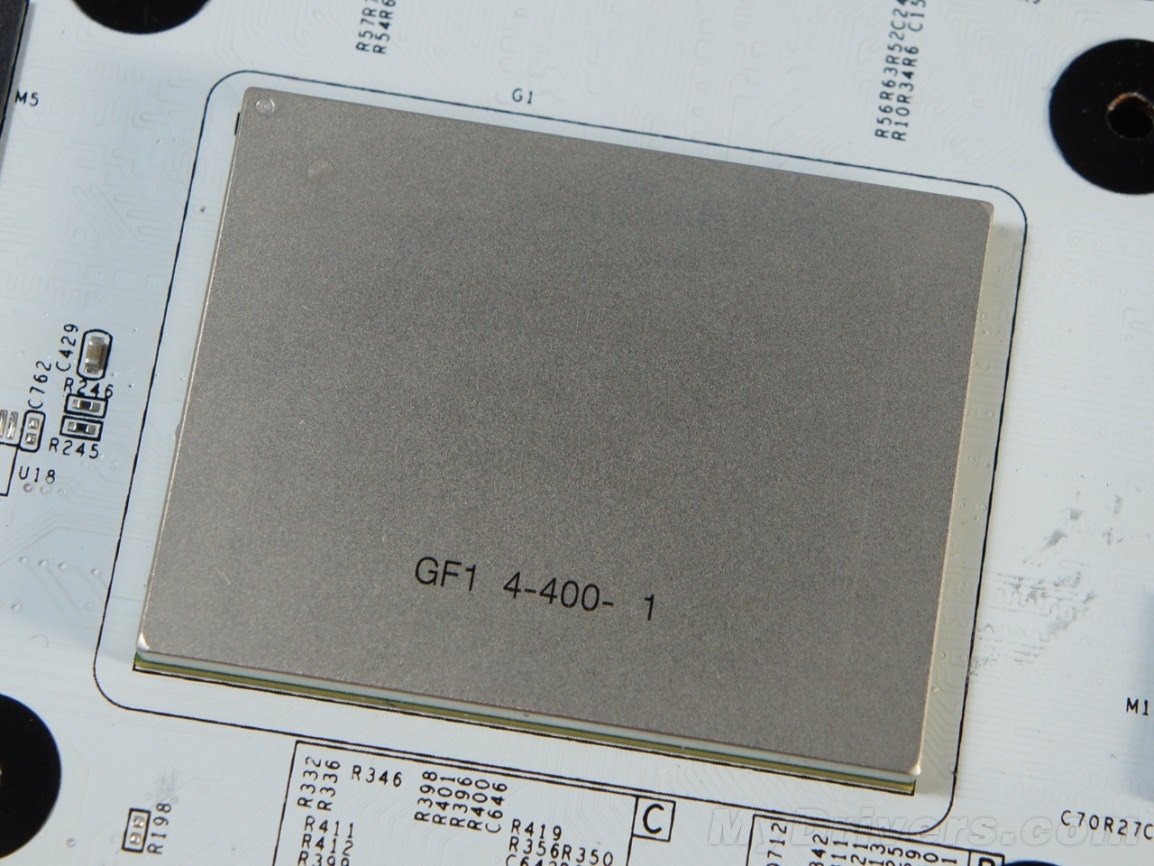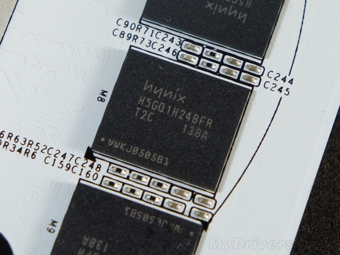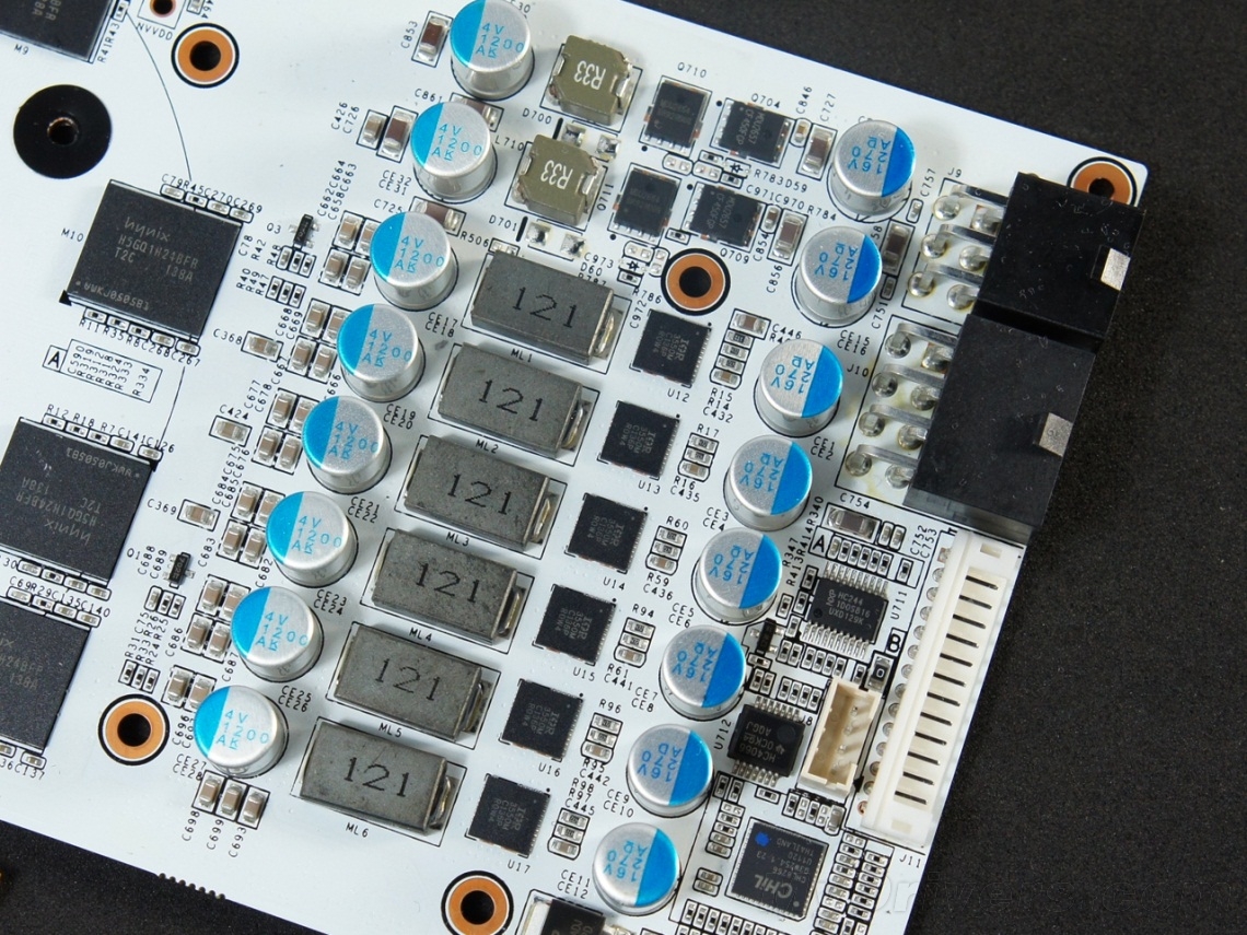 海力士GDDR5 0.4ns显存颗粒,单颗容量128MB,正面8颗组成1024MB/256-bit的显存规格,4400MHz的等效频率同样大幅超出公版的4008MHz。按照我们以往的经验,由于显存控制器的原因,N卡的显存频率普遍不高,所以4400MHz再往上应该不会有太多余量。