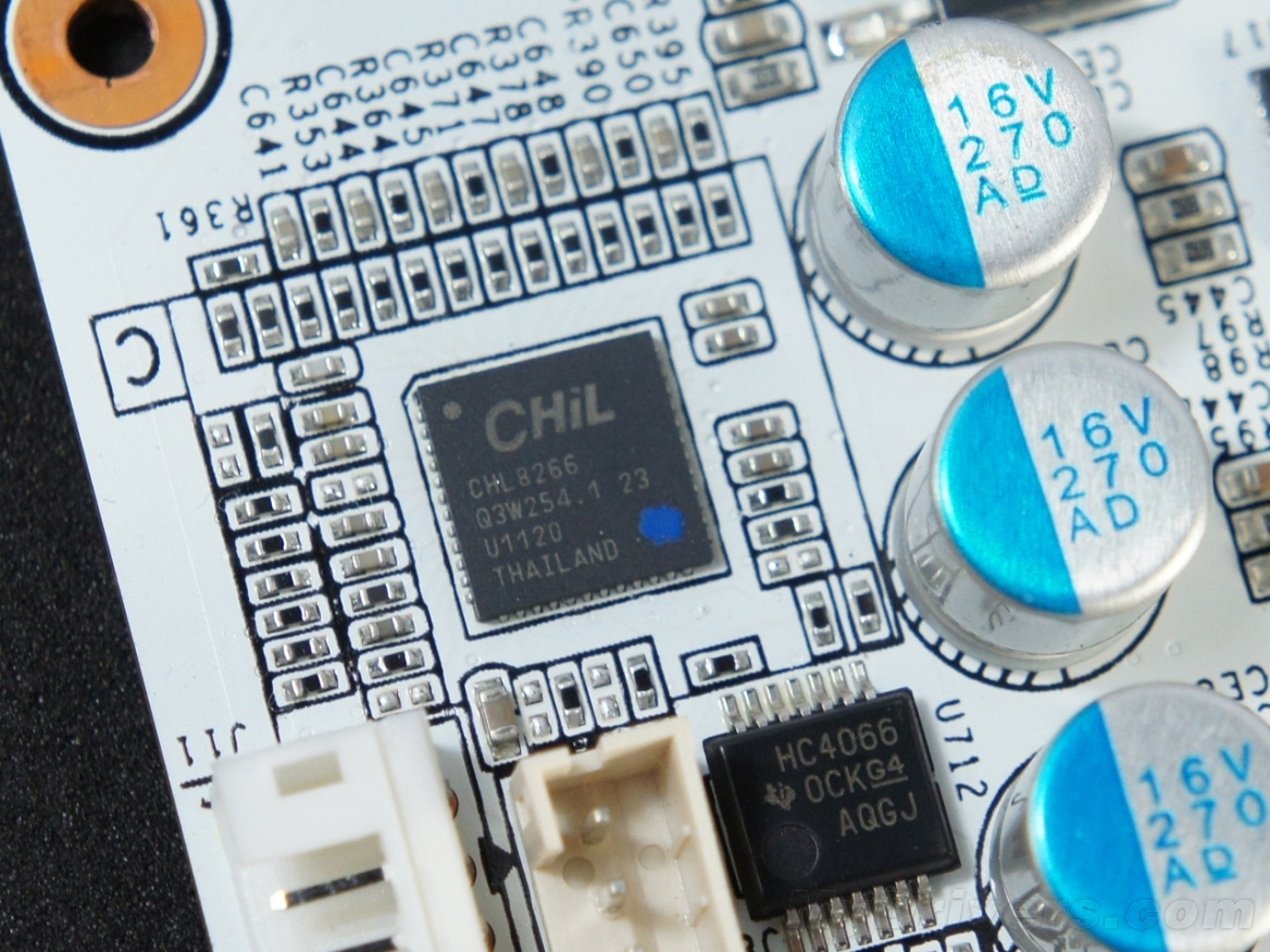 而新款GTX 560 Ti名人堂同样采用了6相核心供电,只不过换成了后来比较流行的CHiL数控方案,核心主控为曾用在GTX 580身上的CHL 8266 PWM芯片,最高支持六项供电电路,最大输出电流可达200A,最高电压2V,最高支持400W的GPU。要说采用这款主控的非公版也不少,也并不稀奇。不过需要注意的是,仅采用CHL 8266主控最多只能算是版数字状态,MOSFET的选用同样是供电方案优劣的重要方面。那新一代名人堂有采用了何种MOSFET呢?