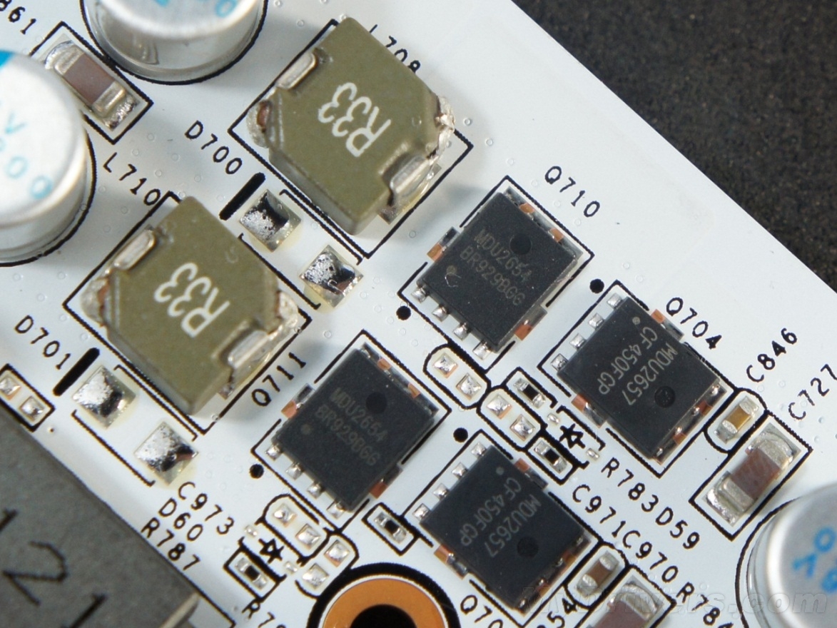 两相显存供电分别配备一上两下Magnachip出品PowerFlat56封装的Mosfet,型号分别为MDU2657(上桥)和MDU2654(下桥),以及R33贴片电感。输出和输出端电容和核心供电一样来自台湾万裕。