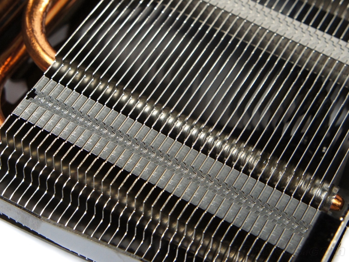 主散热器采用8cm PWM 4pin风扇+大面积铝制散热鳍片+4根8mm纯铜热管+纯铜底座构成。虽然新一代名人堂导风罩采用了全新的镍色电镀工艺,但骨子里还是上代名人堂的散热器。
