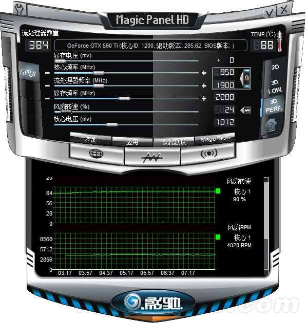 超频潜力:加压1030MHz无压力超频工具采用影驰专用的魔盘(Magic Panel HD),是一款专为玩家打造的一款显卡辅助软件,也是专门针对自家显卡的一款超频、监控、升级驱动的专门工具。玩家可以通过魔盘恢复BIOS、调控风扇转速、对显卡进行超频,同时还可以根据用户显卡型号自动检测最新的BIOS和驱动。