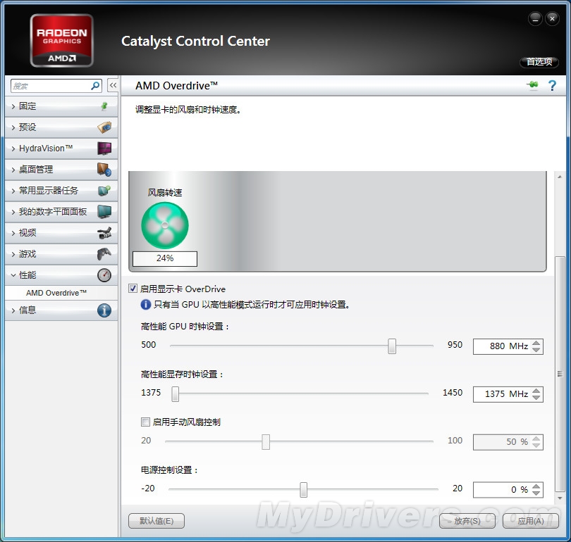 催化剂OverDrive中核心/显存分别被限定在950/5800MHz以下。