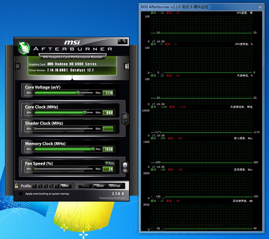温度、转速测试及小结温度部分,选取显卡2D待机以及满载(Furmark,1920x1200极限拷机模式),利用微星Afterburner实时监控,待连续运行带显卡核心峰值温度稳定后,记录此时显卡核心的最高温度。(室温20℃左右)