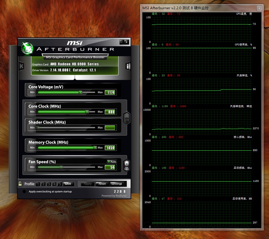 Furmark满载之后,核心温度升到到70℃,但也仅此而已,之后没有进一步升高。风扇转速为56%,转速2270RPM,噪音控制依然良好。