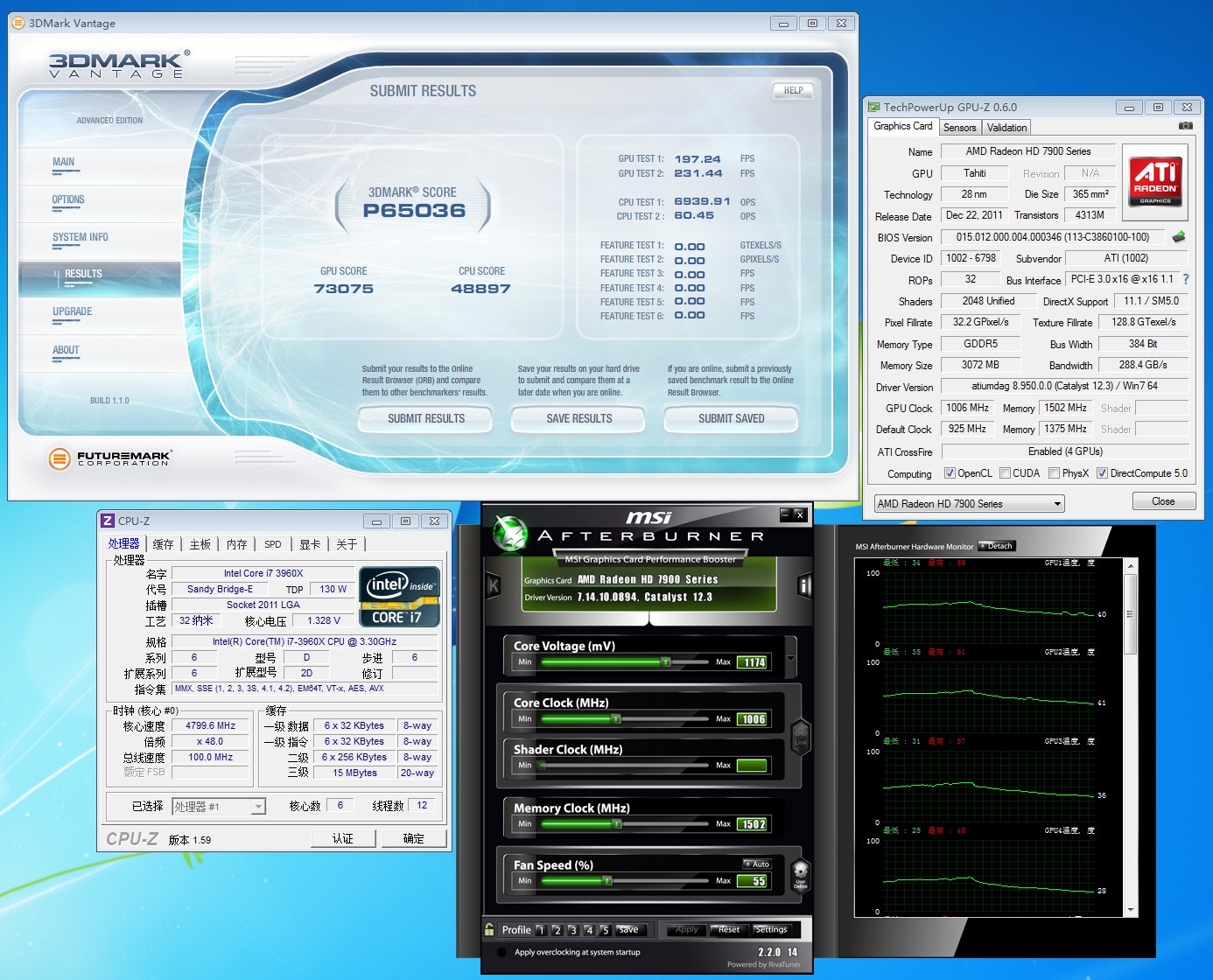 四路HD 7970在3DMark Vantage P模式中成绩为65036