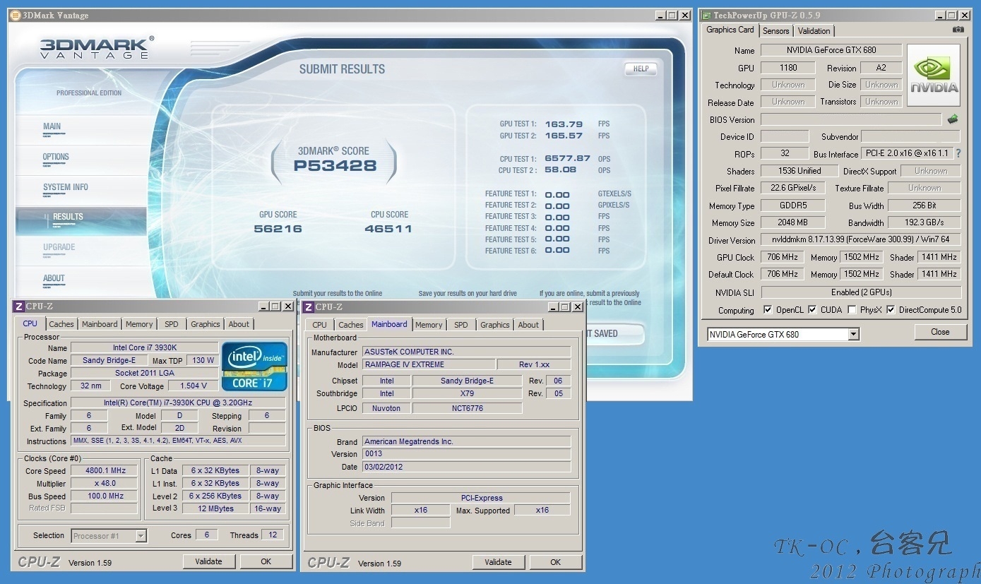 双路GTX 680在3DMark Vantage P模式中成绩为53428
