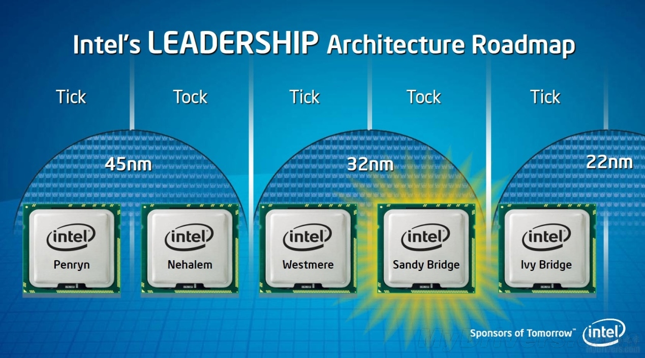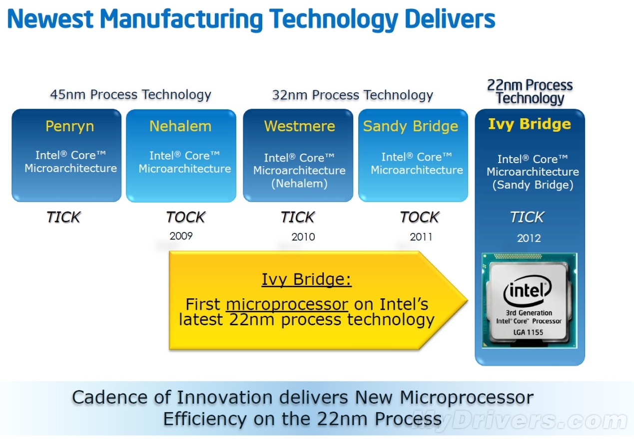 众所周知,Intel近年来一直都在稳步实施着Tick-Tock的交替发展战略,去年的第二代Core家族Sandy Bridge属于一个Tock阶段,也就是在依然使用与第一代Core家族相同的32nm制造工艺前提下,对架构以及技术进行大幅度的调整;而今天发布的Ivy Bridge自然就属于Tick阶段了,就是对架构不做太大的调整,但采用更加先进的22nm制造工艺。