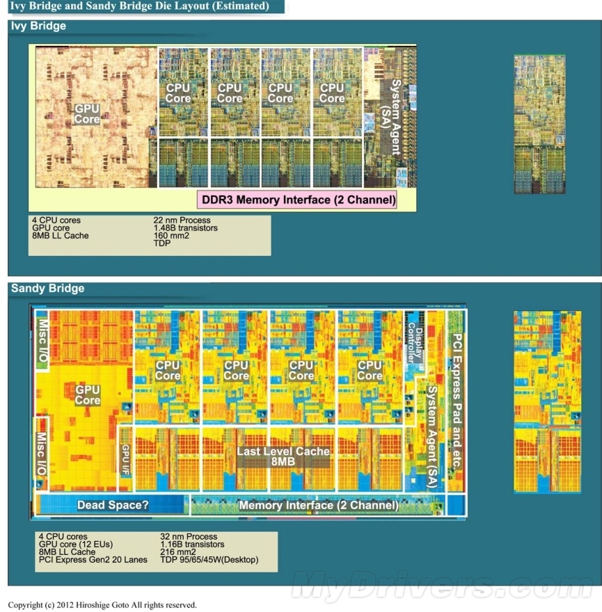图中Sandy Bridge和Ivy Bridge的核心照片采用同样比例尺,选择的Ivy Bridge和Sandy Bridge均为4核心/8MB L3缓存的版本。Ivy Bridge的GPU核心规模由Sandy Bridge的最大12个EU(执行单元)上升至16个。在整体构成相似,GPU性能上升的情况下,Sandy Bridge的核心面积为216mm2,Ivy Bridge的核心面积为160mm2约是前者的74%。