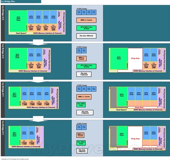 此外Intel还设计有削减GPU以及L3缓存的版本:缓存从最顶级型号的8MB削减至6MB,GPU部分核心面积降低了将近一半。而GPU和CPU构成最简单的版本拥有2个CPU核心,GT1即HD Graphics 2500核芯显卡和3MB缓存,核心面积小于90mm2。