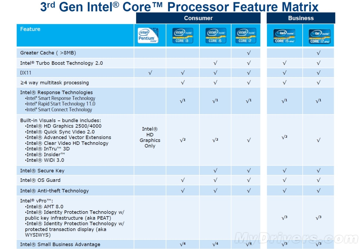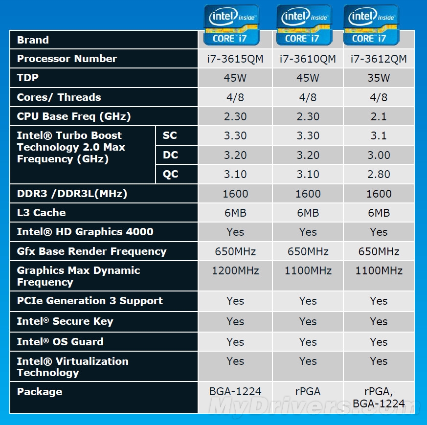 移动平台上文中我们曾说过只有五款,但在Intel幻灯片的规格介绍部分又多出了一款Core i7-3615QM,使总数量达到了6款。