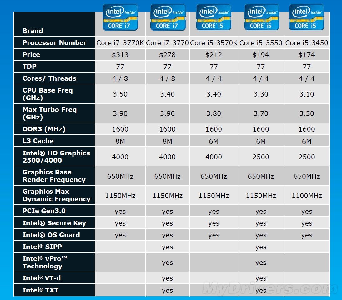顶级的Core i7系列自然还是四核心八线程设计,支持动态加速,整合8MB三级缓存,整合的核芯显卡清一色是HD Graphic 4000,推荐搭配主板上Intel 7系主板中的顶级型号Z77。