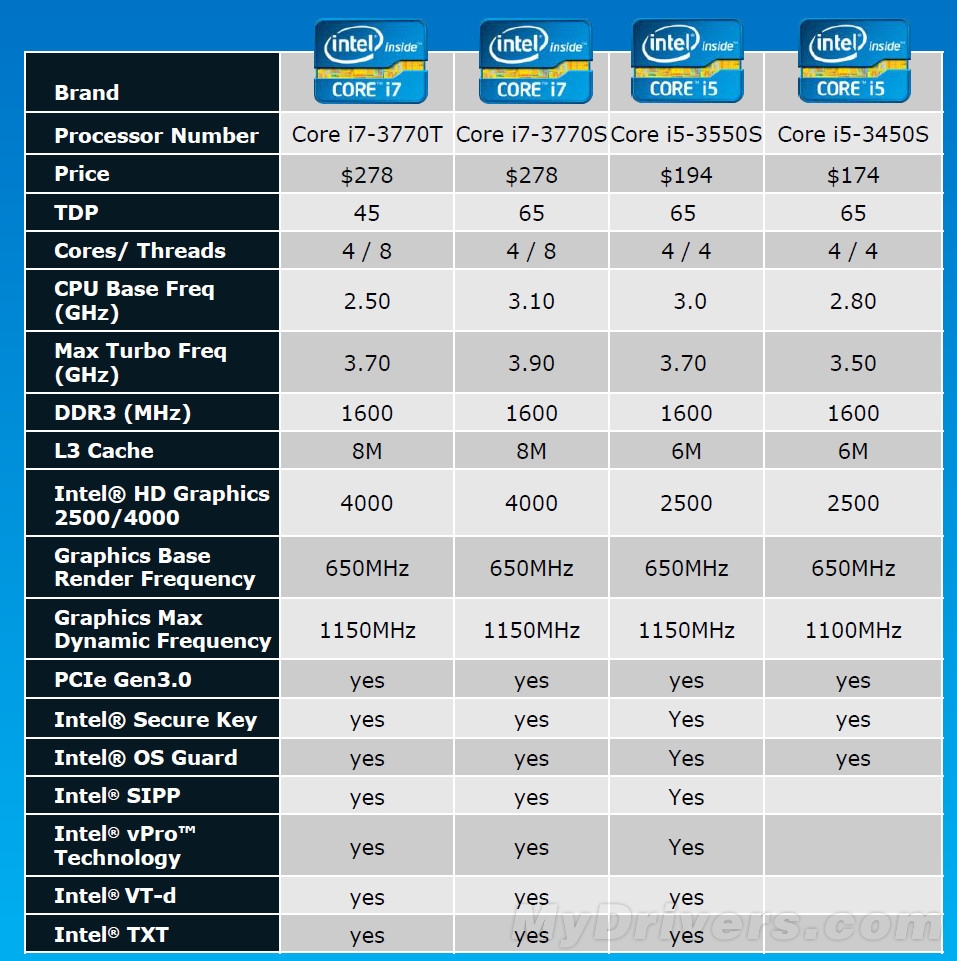 Core i5-3550S主频提升至3.0GHz,动态加速最高3.7GHz,其余规格与i5-3550完全相同,热设计功耗65W,售价194美元。