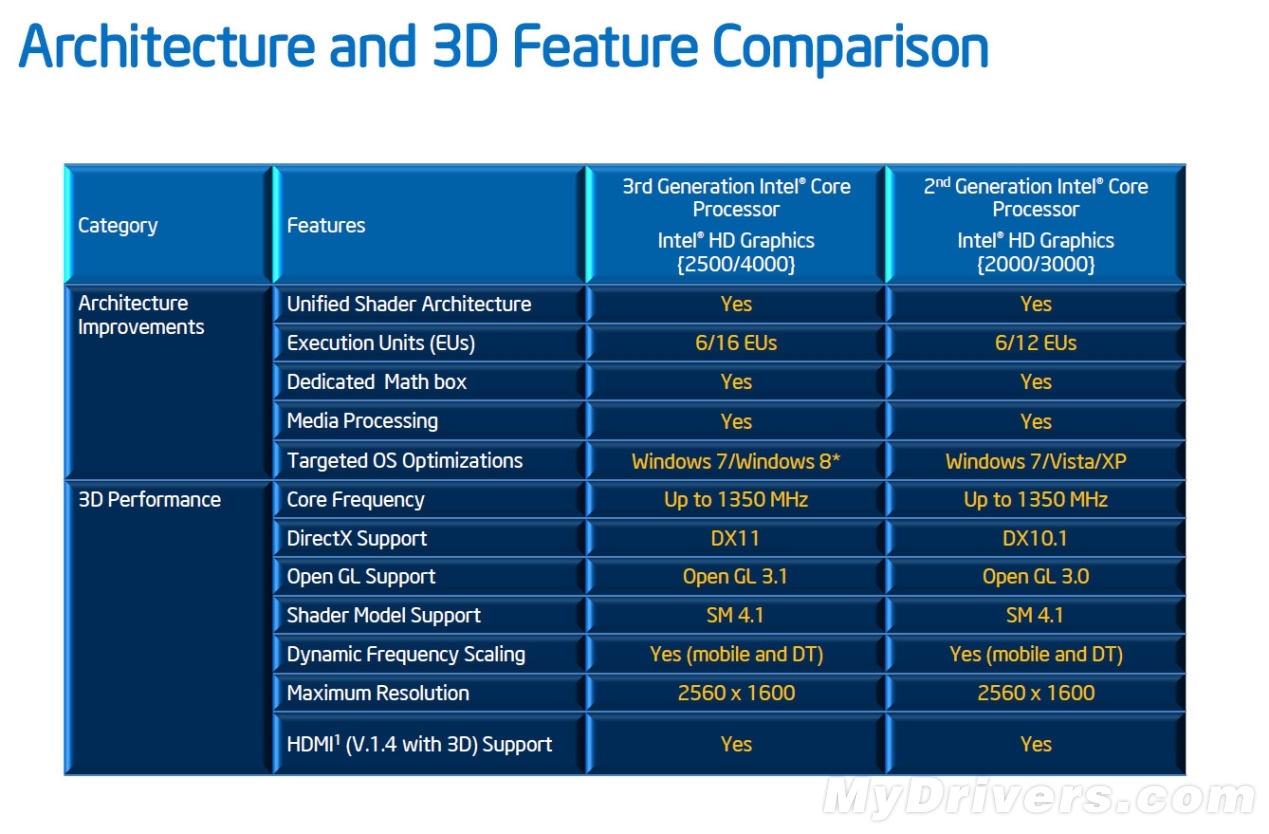 Ivy Bridge所搭载的核芯显卡分为HD Graphics 2500以及HD Graphics 4000两款,分别对应SNB时代的HD Graphics 2000/3000,其中HD Graphics 2500拥有6个EU单元,与HD Graphics 2000相同,但在性能方面要强上不少,而HD Graphics HD则拥有12个EU单元,相比之下HD Graphics 3000则为12个。根据此前的消息,HD Graphics 4000理论性能能够达到HD Graphics 3000的三倍以上。具体特性方面,HD Graphics 2500/4000支持DX11、OpenGL 3.1以及SM 4.1规范。