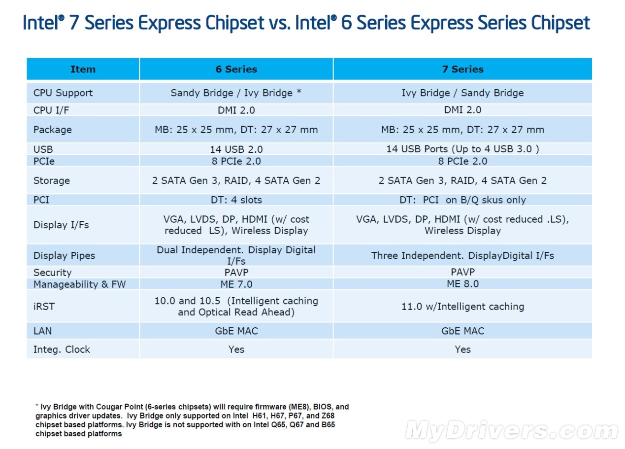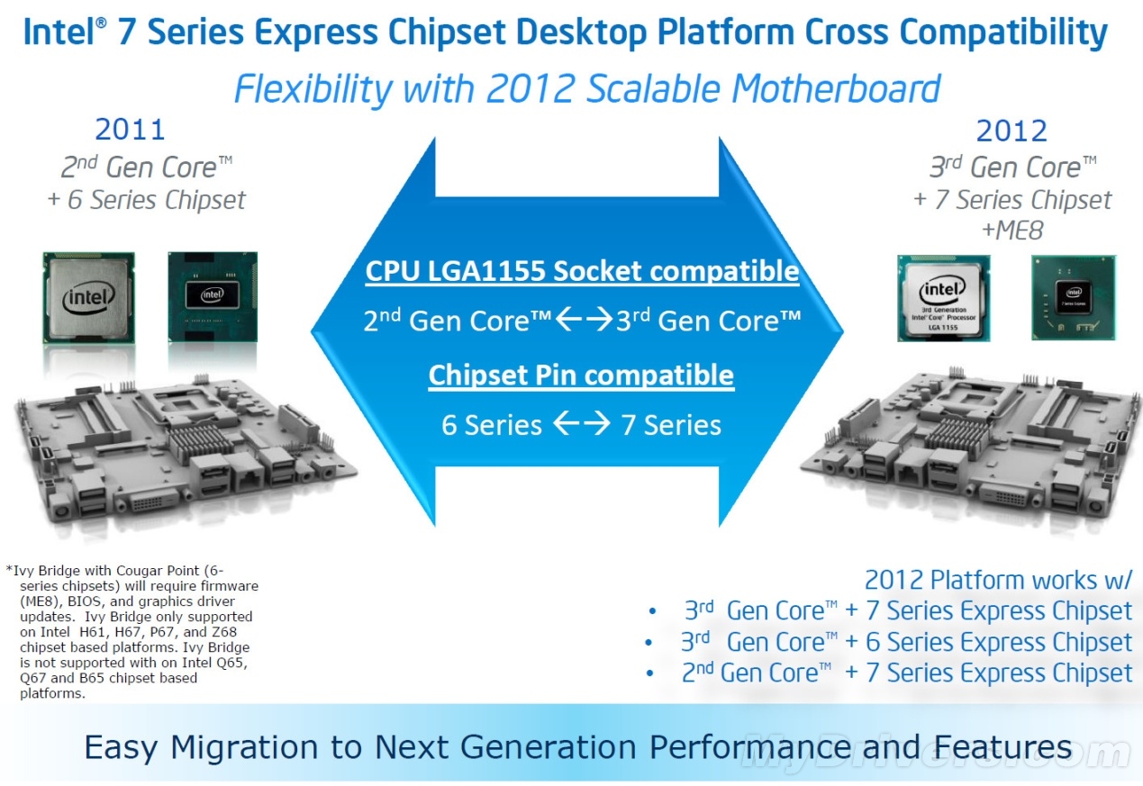 【6系与7系:难得一见的兼容】去年Sandy Bridge发布时候Intel就在路线图中表示“下一代”Ivy Bridge处理器不会更换接口,很罕见的出现了一次向下兼容。