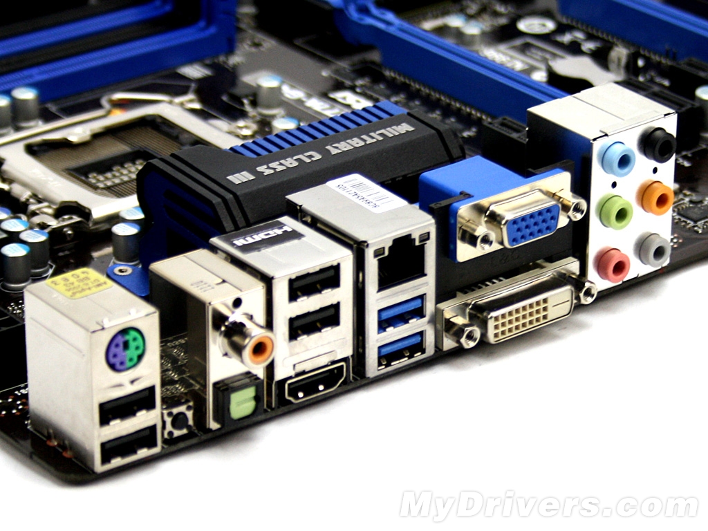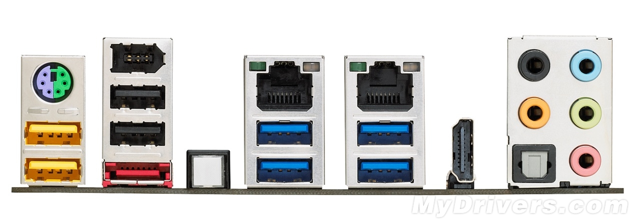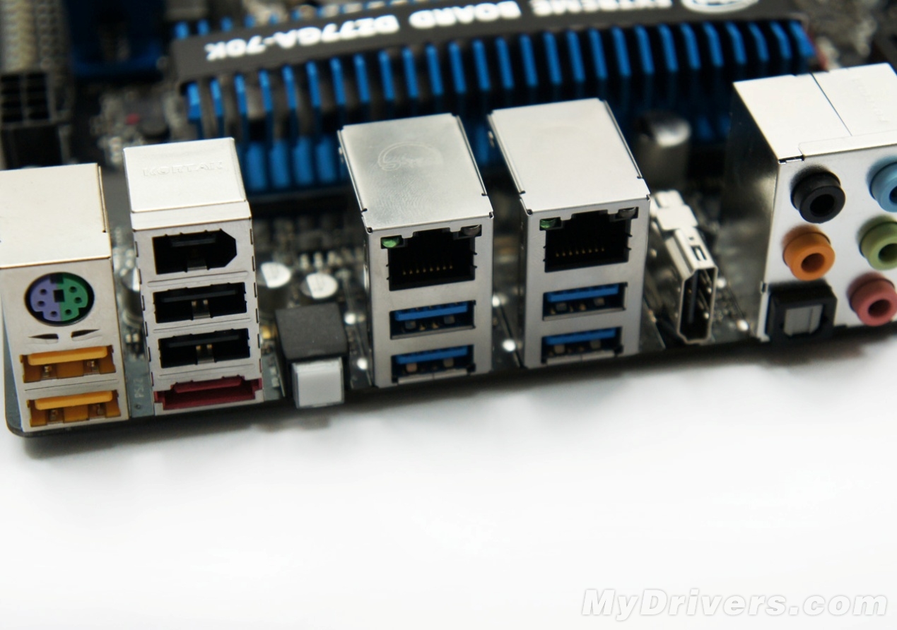 I/O部分也比较丰富,包括一个PS/2键鼠接口、四个USB 2.0接口、VGA/DVI/DHMI/DisplayPort视频输出接口、两个USB 3.0接口、eSATA接口(Z77芯片组原生提供的SATA 3Gbps转接而来)、光纤接口以及模拟音频输出接口。