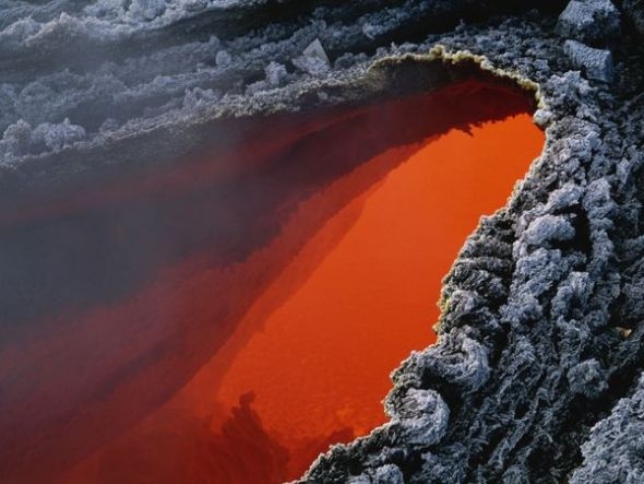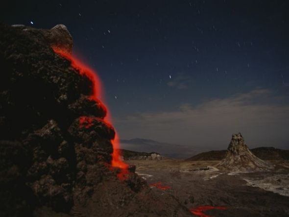 荧橙色岩浆流如瀑布一般从伦盖伊火山(Ol Doinyo Lengai)倾泻而下,流入坦桑尼亚的东非大裂谷。Ol Doinyo Lengai在马赛语中是“神山”的意思,是世界上仅有的一座喷发natrocarbonatite岩浆的火山。Natrocarbonatite 岩浆是一种流动性极强、几乎不含硅的熔岩。