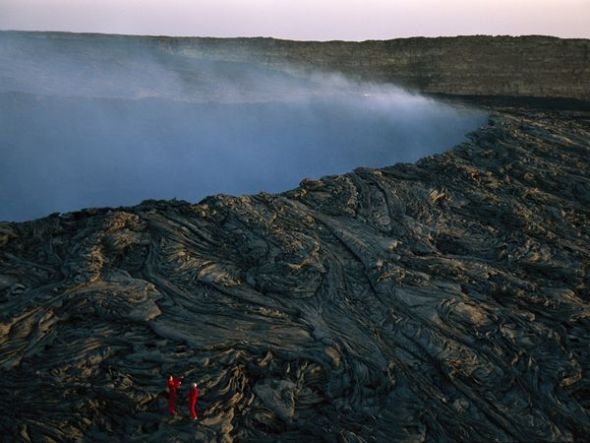 登山者爬上埃塞俄比亚厄塔尔火山的火山口螺旋状火山岩,与此同时,蒸汽从温度高达1868华氏度(约合1020摄氏度)的火山口熔岩湖中喷涌而出。