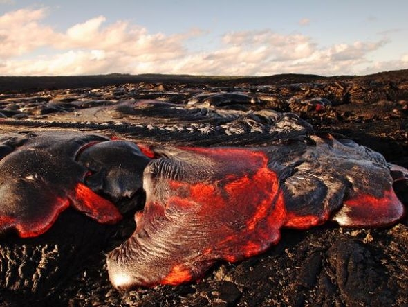 绳状熔岩在美国夏威夷火山国家公园的基拉韦厄火山表面流淌。与块状熔岩不同,绳状熔岩流淌速度相对缓慢,形成一个隔热的表面,令熔岩温度保持在近2190华氏度(约合1200摄氏度)。另一方面,块状熔岩流淌速度更快,没有时间形成外皮,导致较冷的岩浆呈现更有棱角的质地。