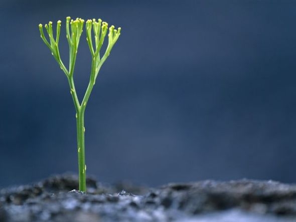 一种蕨类植物从夏威夷火山国家公园刚刚冷却的熔岩中长出来。植物可以在受火山喷发影响的地区迅速恢复生长。随着时间的推移,熔岩和火山灰分解形成肥沃的、适于农业生产的土地。