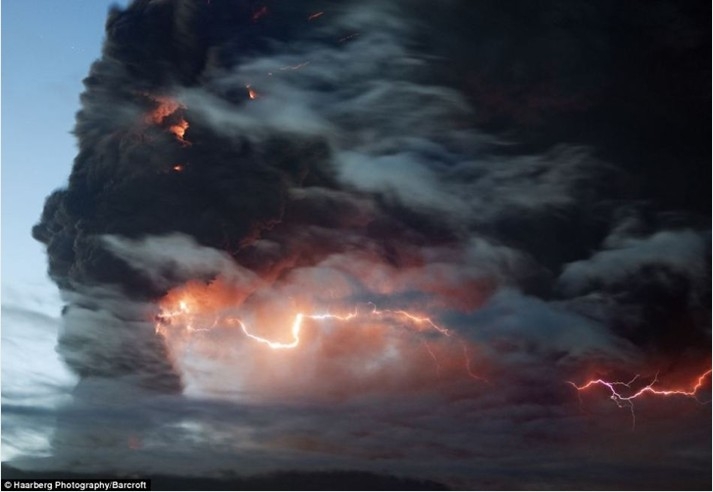 这些照片都是从9000英尺(2700米)的空中拍摄的冰岛美景。这些照片的作者是一对夫妇乘坐飞机飞越这个美丽国度的上空并纪录下这些美轮美奂的景致。图为埃亚菲亚德拉火山喷发尘埃云中的闪电。