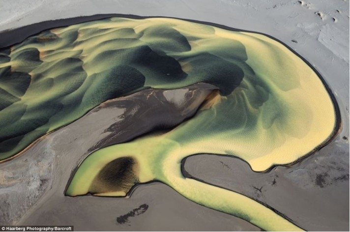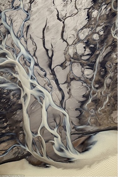 在其中一张照片中,他们抓拍到了冰岛埃亚菲亚德拉火山(Eyjafjallaj kull)爆发云团中爆裂开的闪电,这座火山的剧烈爆发曾经在2010年完全打乱了欧洲的空中航线秩序。另外一张照片看上去像是一棵树,但是这其实是一条河流三角洲,水流在这里向不同的方向分叉。图为一条河流蜿蜒流过冰岛灰色的沙地。