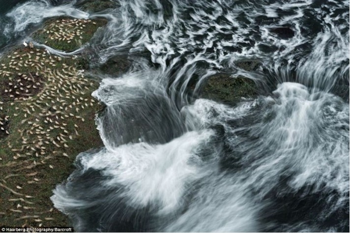 延时摄影:海边一群正在岩石上觅食的红结鸟,旁边是波涛汹涌的大海。令人难以置信的是,天公作美,这对夫妇仅用了一次历时5小时的飞行便将整个冰岛全境巡视了一遍,直到飞机因为油料耗尽而不得不返回地面。