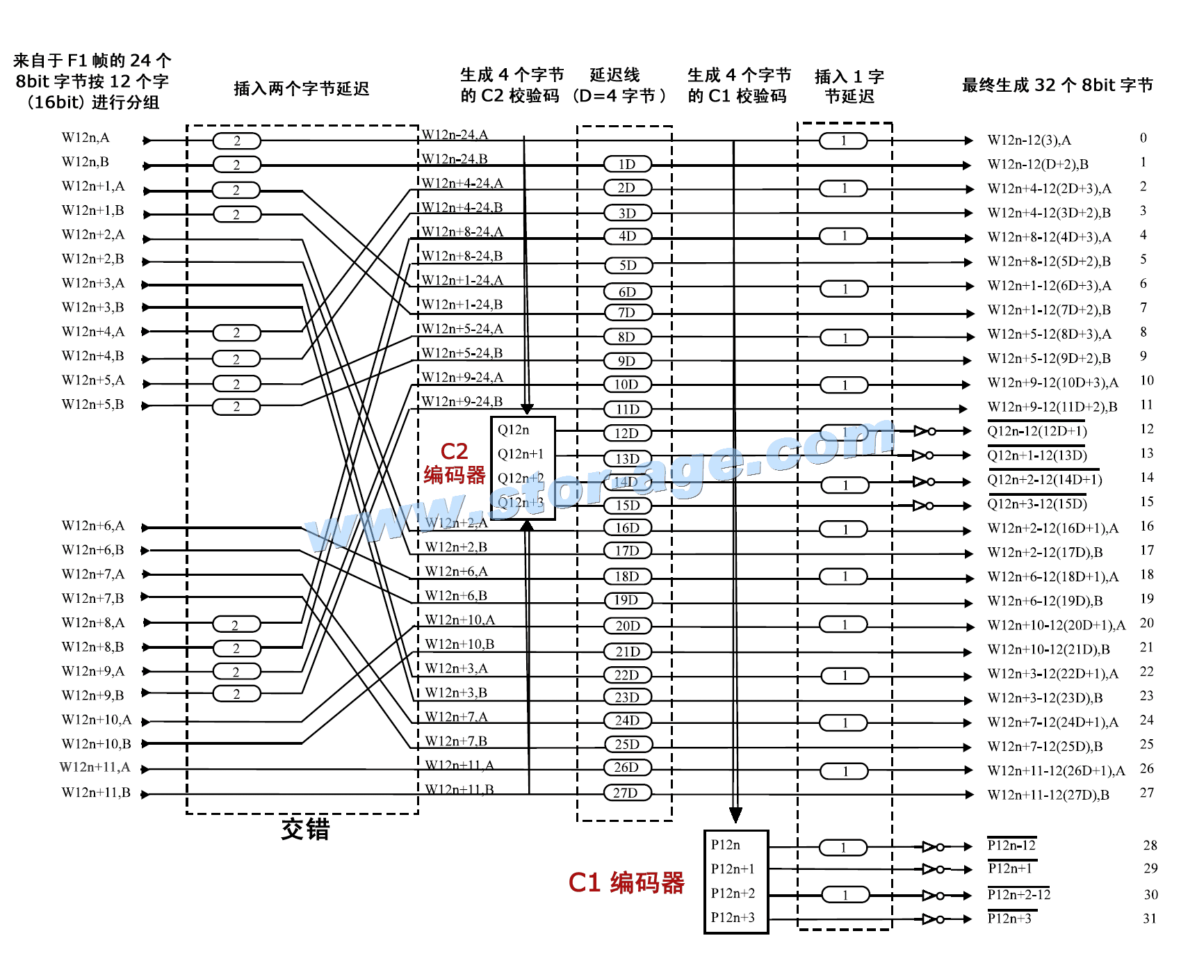 CIRC编码流程图(点击放大),图出的W12代表组成一个F1帧的12个字(16bit),n代表F1帧的编号,A、B代表组成一个字的两个字节(8bit)