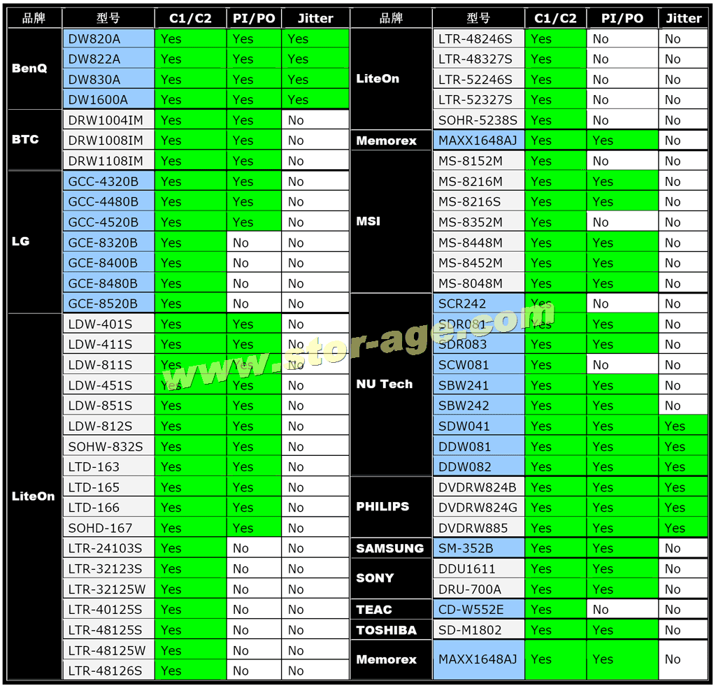 光盘质量测试在不同支持光驱下可进行C1/C2、PI/PO或Jitter的测试