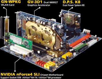接下来就该是怪兽级的技嘉GA-K8NXP-SLI和GV-3D1套装出场了。nVIDIA推出SLI时我们就想到了voodoo2 SLI,技嘉套装的核心—单卡双GPU的GV-3D1 则令我们联想到了3DFX Voodoo5,这些技术会是来自于被nVIDIA收购的3DFX吗?当然不是,3D1技术是技嘉技术工程师的杰作。在评测室的《单卡多核心 VS SLI—技嘉3D1显卡小试牛刀》一文中,您可以一睹其风采。