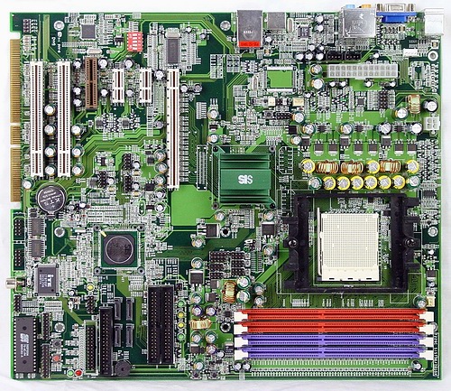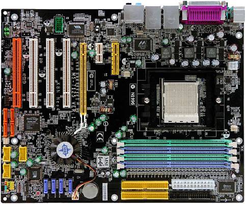 SiS756工程样板采用SiS756和SiS965的南北桥芯片。由于Socket 939的AMD Athlon64处理器已经集成了内存控制器,所以SiS756的主要任务就是负责连接CPU和专心处理PCI-Express X 16显卡插槽,其余的如SATA和USB甚至包括PCI-Express X 1都统统交给了SiS965南桥芯片来处理,这使得SiS756工程样板的PCI-Express X 16显卡插槽工作效率特别高,在后面的测试中也证明了这一点。