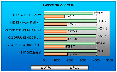 由于Socket 939的AMD Athlon64集成内存控制器,理论上来讲Cachemem内存读写测试成绩应该相差不大,但是实际测试中还是出现了得分差距,而且有些主板打开双通道以后并不稳定,SiS主板居然还挑内存,真令人困惑。