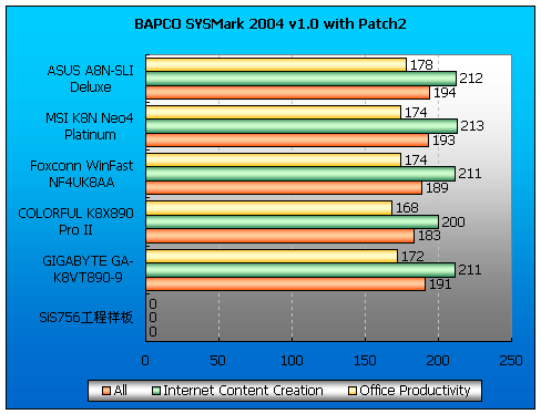 SYSMark2004非常真实的模拟了Office应用环境,即使在本次测试这样高的配置上SYSMark2004运行一遍也至少需要4~5个小时,不太稳定的SiS756工程样板通过了其它所有测试,但是在SYSMark2004面前多次倒下;各芯片组主板的SYSMark成绩相近。