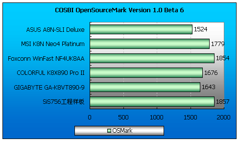 COSBI OpenSourceMark是一套非常优秀的开源测试软件,SiS756工程样板依然取得了最高分,nForce4 Ultra其次,VIA得分最低明显和其磁盘性能较低有关。