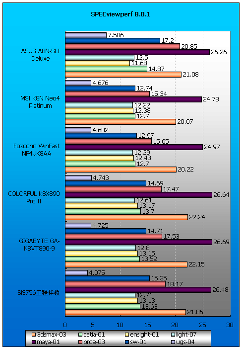 考验专业制图性能的SPECviewperf 8.0.1中A8N-SLI以其SLI优势夺得第一,说明SLI可以带来专业制图的性能提升,如能通过测试认证,专业软件厂商又能推出相关插件,SLI技术完全可以应用于专业制图领域,而不仅仅是游戏,这对图形工作站领域而言,应该是个不错的消息。SiS、VIA芯片组主板的SPECviewperf的得分要比nForce4 Ultra高出一点。