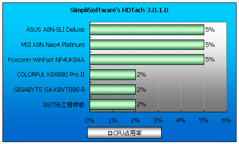 很明显,VIA K8T890芯片组主板的磁盘性能是最低的,但是VIA的优势在于它较低的CPU占用率(2%),nFORCE主板(5%)的CPU占用率相对于本次测试所使用的这块AMD Athlon64 4000+而言可一点而也不低。