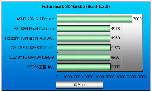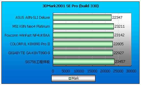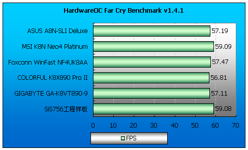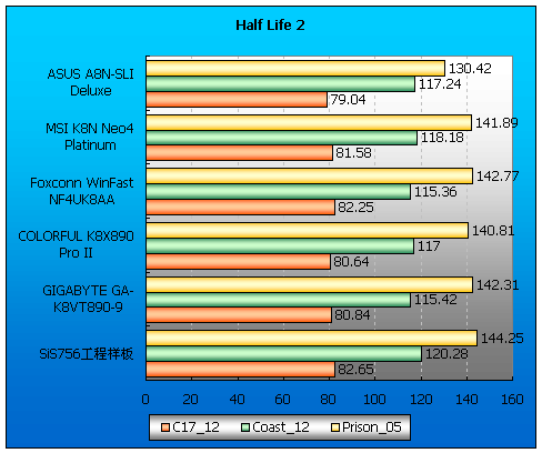几乎所有的游戏性能测试中SiS756工程样板都取得了最高的得分(SLI除外),nForce4 Ultra芯片组主板的游戏部分得分和VIA K8T890芯片组主板基本相近。