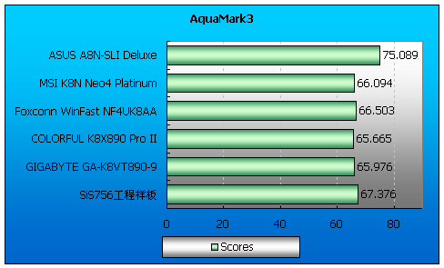 SiS756工程样板得分最高,VIA主板其次,nVIDIA得分最低,A8N-SLI得分最低应该是与其上的6600GT SLI 在PCMark04中图形性能得分低有关。